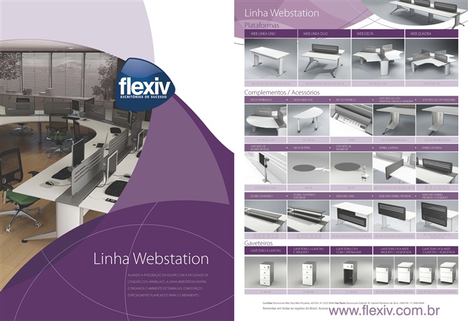 Flexiv - Linha Webstation móveis para escritório ALIANDO A INTEGRAÇÃO DA EQUIPE COM A FACILIDADE DE CONEXÃO DOS APARELHOS, A LINHA WEBSTATION INSPIRA E ORGANIZA O AMBIENTE DE TRABALHO, COM ESPAÇOS ESPECIALMENTE PLANEJADOS PARA O CABEAMENTO. Linha Webstation Flexiv - Linha Webstation móveis para escritório Linha Webstation Plataformas Complementos / Acessórios Gaveteiros Curitiba Showroom Nilo: Rua Nilo Peçanha, 420 Tel.: 41 3322.9006 São Paulo Showroom Gabriel: Al. Gabriel Monteiro da Silva, 1984 Tel.: 11 3086.0068 Revendas em todas as regiões do Brasil. Acesse GAVETEIRO 4 GAVETAS GAVETEIRO 2 GAVETAS E ARQUIVO GAVETEIRO CPU COM CARENAGEM GAVETEIRO VOLANTE ARQUIVO / ALMOFADA GAVETEIRO VOLANTE 3 GAVETAS / ALMOFADA MESA PENÍNSULA MESA MEIA-LUA SUPORTE DE MONITOR VESA 31L 46P 64A 31L 46P 64A 31L 54P 64A 39,5L 47P 53A | 39,5L 47P 60A (ALMOFADA) 39,5L 47P 53A | 39,5L 47P 60A (ALMOFADA) 150L 73P 2,5E | 135L 73P 2,5E | 120L 73P 2,5E 150L 75P 2,5E | 135L 75P 2,5E | 120L 75P 2,5E AJUSTE VERTICAL 110mm 114L 75P 2,5E <120° 150L 75P 2,5E <90° 114L 75P 2,5E <120° 150L 75P 2,5E 180CM PAINEL FRONTAL 80L 43A 1,2E | 95L 43A 1,2E 110L 43A 1,2E | 125L 43A 1,2E SUPORTE DE MONITOR 30D 17H SUPORTE DE CPU WEB DUO, DELTA E QUADRA SUPORTE DE CPU WEB UNO 23L 53,5P 48A ENGATE 40mm 23L 53,5P 48A ENGATE 30mm WEB UNO SAIA WEB UNO PAINEL FRONTAL WEB UNO PAINEL FRONTAL ESTENDIDO PAINEL LATERAL 68,5L 35A 2,5E | 68,5L 20A 2,5E | 68,5L 10A 2,5E 95L 71,5A 1,2E | 110L 71,5A 1,2E 95L 43A 1,2E |110L 43A 1,2E | 125L 43A 1,2E 95L 43A 1,2E |110L 43A 1,2E | 125L 43A 1,2E 125L 71,5A 1,2E KIT ELETRÔNICO PLANO SUSPENSO PLANO SUSPENSO SUPERIOR MESA ROTÁTIL 60D 1,8E 85L 27P 2,5E | 100L 27P 2,5E 115L 27P 2,5E | 130L 27P 2,5E 85L 27P 2,5E | 100L 27P 2,5E 115L 27P 2,5E | 130L 27P 2,5E WEB LINEA UNO WEB LINEA DUO WEB DELTA WEB QUADRA