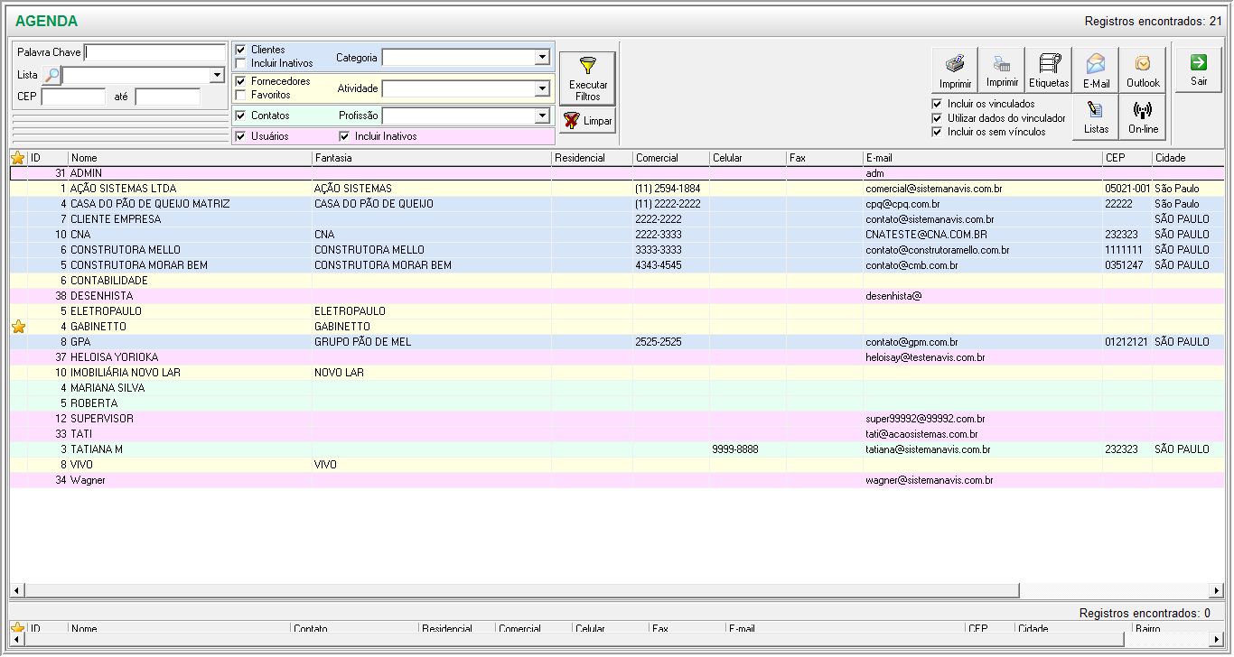 - A tela disponibiliza recursos de exportação dos registros para o Outlook, geração de etiquetas e impressão. A utilização de filtros ou listas previamente cadastradas facilita o uso destes recursos (pois refinam a informação que será utilizada).