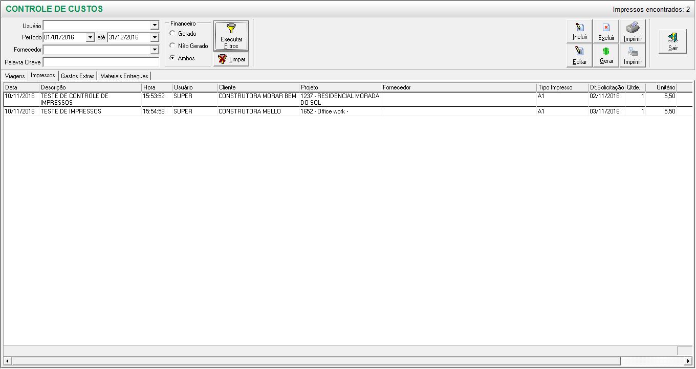 - O recurso de impressão esta disponibilizado em dois botões. O primeiro é a impressão da tela escolhida de acordo com seu filtro e o segundo além de seguir o filtro, possui o recurso de customização.