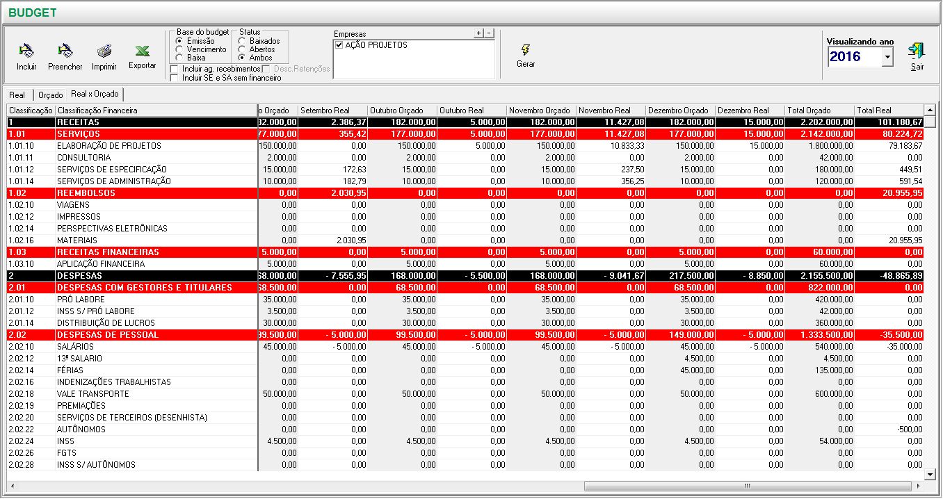 - O relatório possui 3 abas, são elas: Real que exibe os valores praticados em contas a pagar e receber, Orçado é utilizada para criação do planejamento anual, sendo preenchida manualmente e a Real x Orçado que é a junção das duas abas anteriores com o objetivo de comparar os valores.