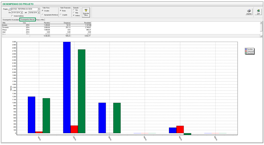 - Aba desempenho mensal demostra um gráfico de barras mensal sobre receitas e despesas e resultados dos projetos.
