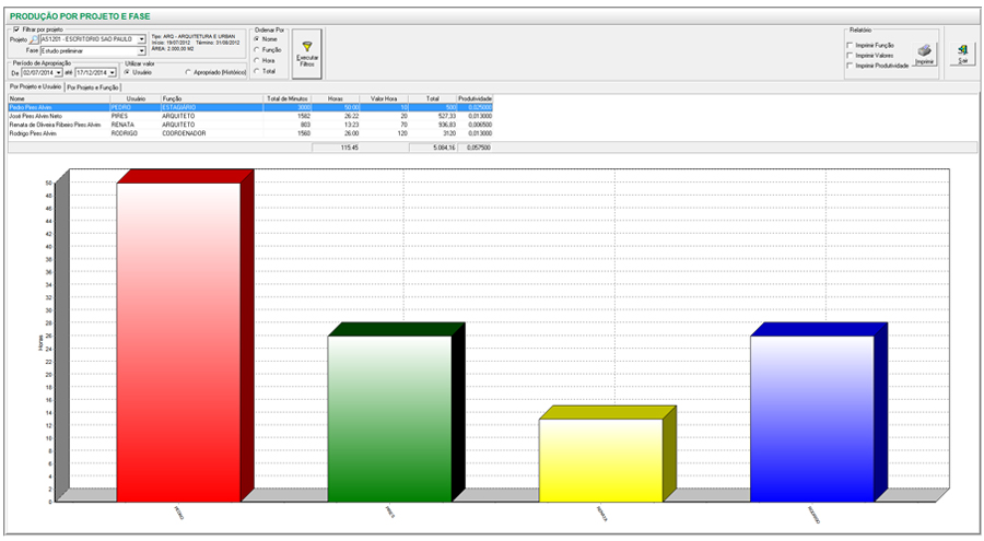 - Ao selecionar o projeto o Navis busca todas as horas apropriadas por usuário e dividi as mesmas pela metragem definida no cadastro projeto. Esse processo define a produtividade que foi executada no projeto. A análise pode ser realizada por usuário ou por função divididos em fase.