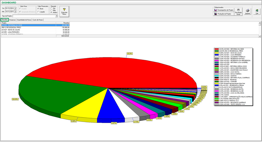 - Aba receitas: gráfico em formato de pizza que demostra as receitas diretas dos projetos dentro do filtro selecionado.
