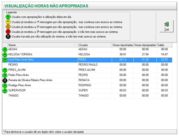 - Para destravar um usuário clique duas vezes sobre o mesmo.