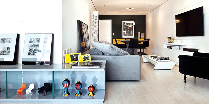 Tudo favorece a atmosfera moderna que ele queria ao contratar a designer. O piso recebeu algumas pinceladas divertidas do atual amarelo lamborguini.