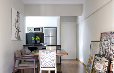 A mesa de jantar retangular, com as cadeiras nas cabeceiras e em um dos lados gera mais circulação. O armário, ao lado do sofá do home é utilizado como roupeiro. A cozinha foi aberta para dar mais amplitude visual. A bancada é usada para refeições curtas, como aparador de apoio da sala de jantar. O banheiro ganhou mais leveza com o uso de pastilhas e louças brancas, e bancada de vidro.