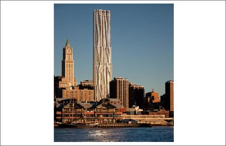 Famoso internacionalmente por criar o Museu Guggenheim, de Bilbao; o arquiteto norte-americano Frank O. Gehry projetou seu primeiro edifício residencial. O local privilegiado não poderia ser outro: Manhantan, Nova York. Com 265 metros de altura, o edifício é considerado o mais alto da cidade, além de ser o prédio residencial mais grandioso de todo hemisfério ocidental. Ao projetar o edifício, Gehry reinterpretou a linguagem dos arranha-céus de Nova York. Em sua visão, o projeto sinuoso, com ondulações de aço inoxidável, reflete a mudança de luz, transformando a visão do edifício ao longo do dia.