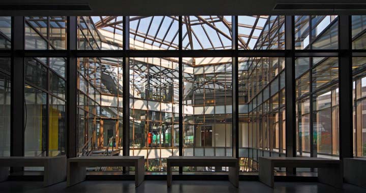 Um vão é criado por um átrio de pé-direito triplo no centro do volume, com uma ponte suspensa e caixas de escada que o atravessam.