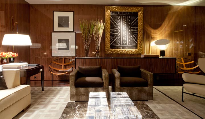 Para compor o espaço, móveis da marca italiana Cassina com referência da década de 1960, poltronas de taxas feitas pela Érea especialmente para o espaço e toques étnicos que aparecem nas estampas das poltronas e nos objetos.