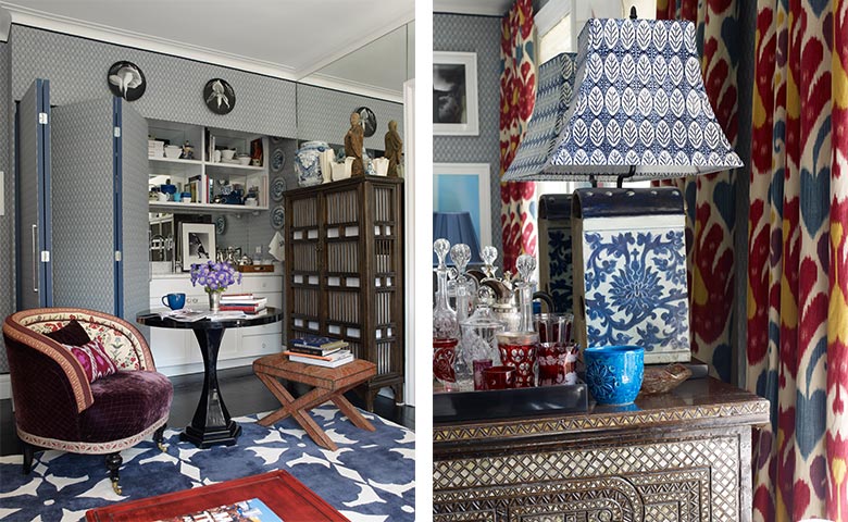 “A pretensão aqui foi a de fazer um ninho, um home-sweet-home”, explica esse perfeccionista sobre o décor feito a quatro mãos com Murilo. “Sou muito organizado, adoro tudo perfeito, paralelo, enfileiradinho”, completa o profissional exigente. Em escala menor, o apartamento com piso de madeira ebanizada lembra uma manor house inglesa com peças garimpadas em viagens, objetos de várias proveniências e, claro, muitos tecidos para acentuar o clima de aconchego, uma das marcas de seu estilo inconfundível. “Tenho um estoque de tecidos. Por onde viajo compro tecidos lisos, estampados, bordados, antigos”, referindo-se não só aos estofados e à coleção de almofadas, mas também às cortinas com desenho de ikat indonésio, à colcha antiga bordada em vermelho, comprada em uma viagem a Jaipur, na Índia, dobrada sobre a cama, e ao elegante tecido de parede (“não é papel, não”) que forra toda a casa, criação dos teares da Maison Pierre Frey, de Paris.